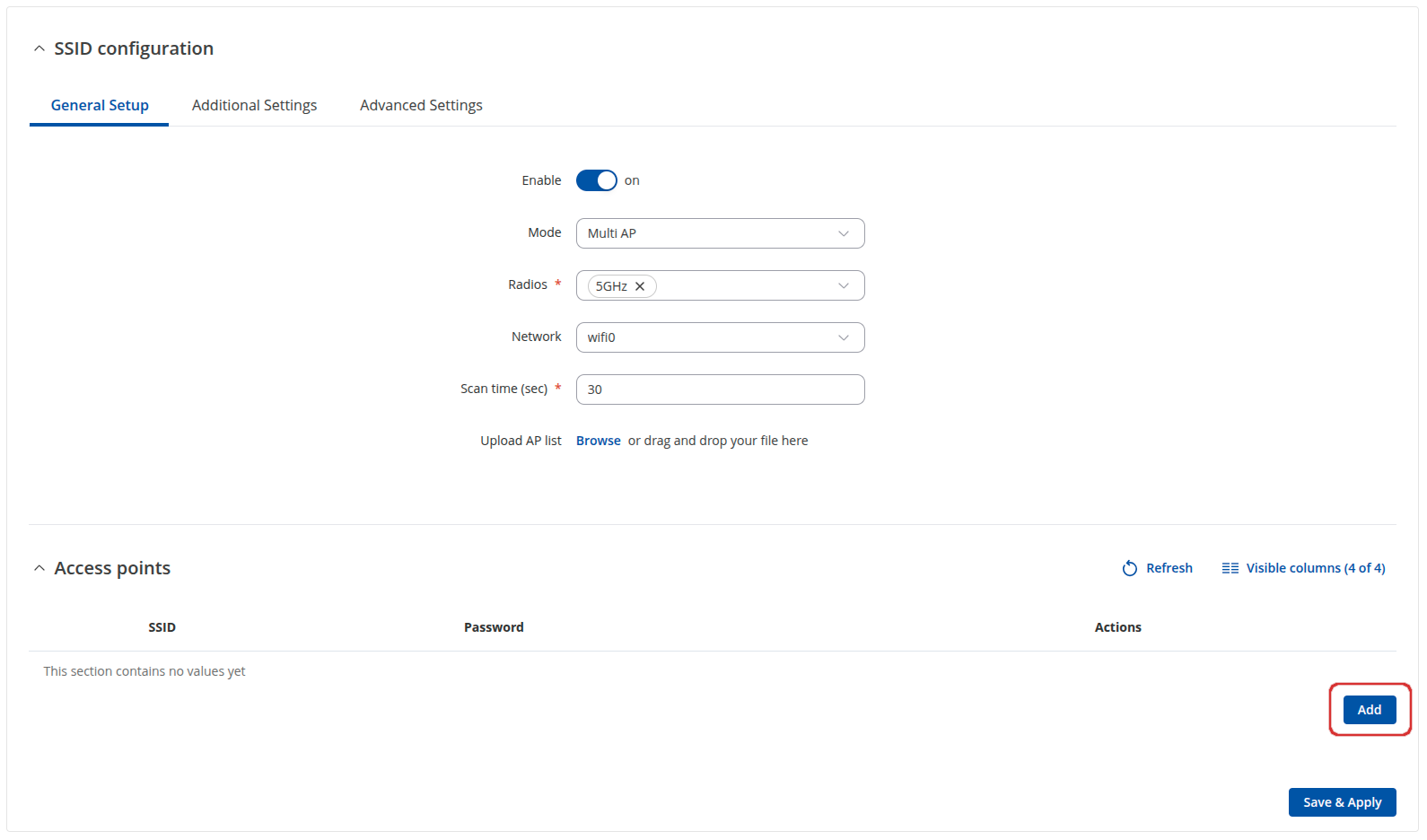 Under the Access Points section, click Add, then configure the SSID and Password of your WiFi network. You can add multiple WiFi networks.