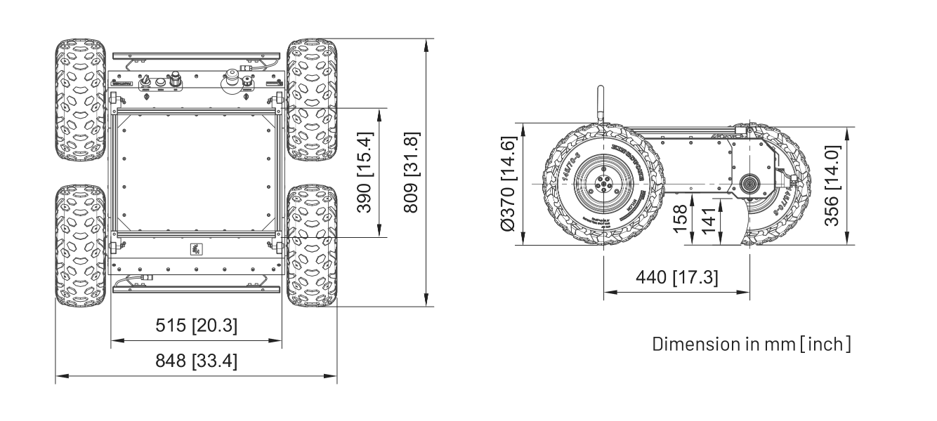 | Wheel | 4 | WH01 - 370mm standard off-road wheels, WH02 - 203mm mecanum wheels. A recommended tire pressure for WH01 option is 1.0 to 1.5 bar (14 to 22 psi). |