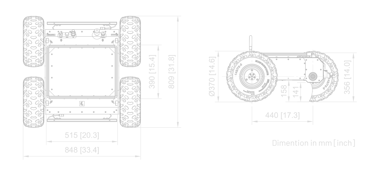 | Wheel | 4 | WH01 - 370mm standard off-road wheels, WH02 - 203mm mecanum wheels. A recommended tire pressure for WH01 option is 1.0 to 1.5 bar (14 to 22 psi). |