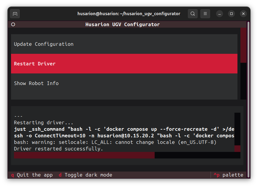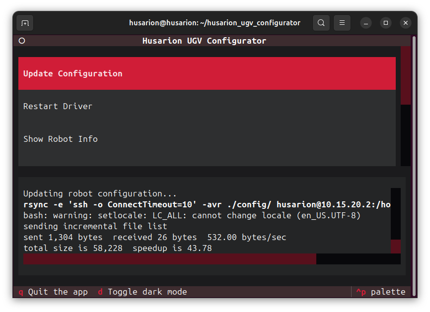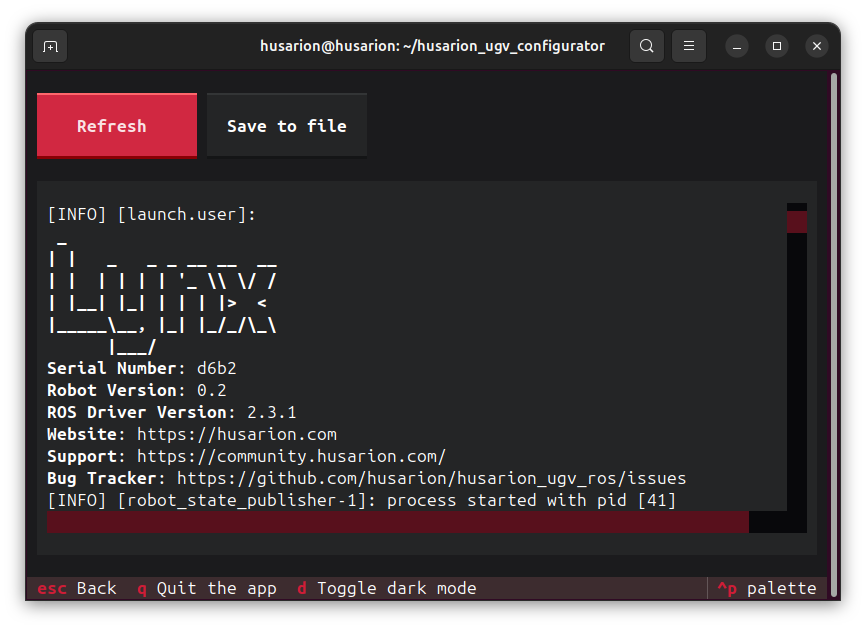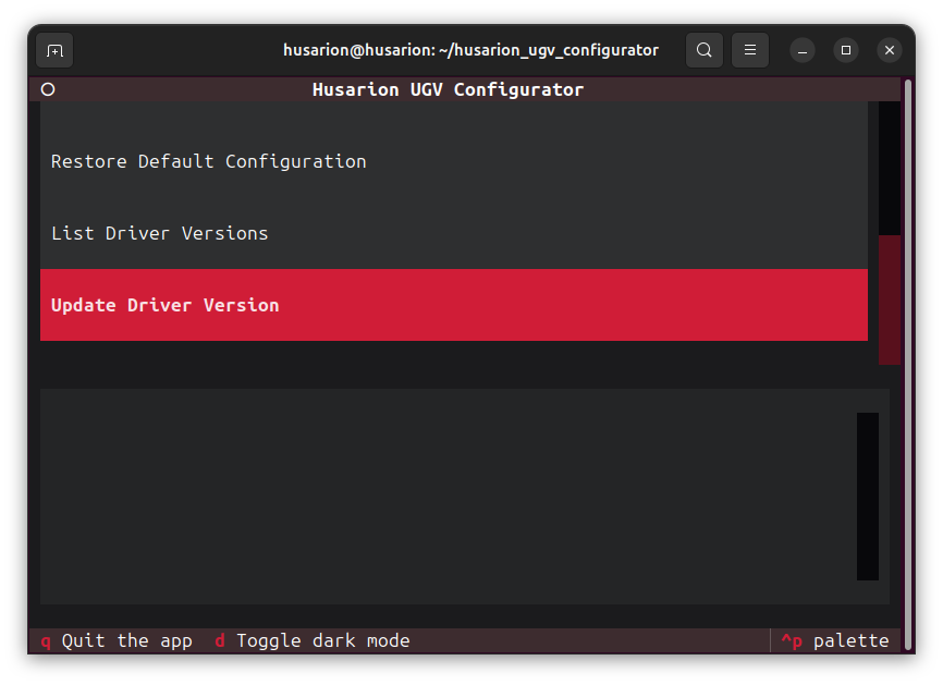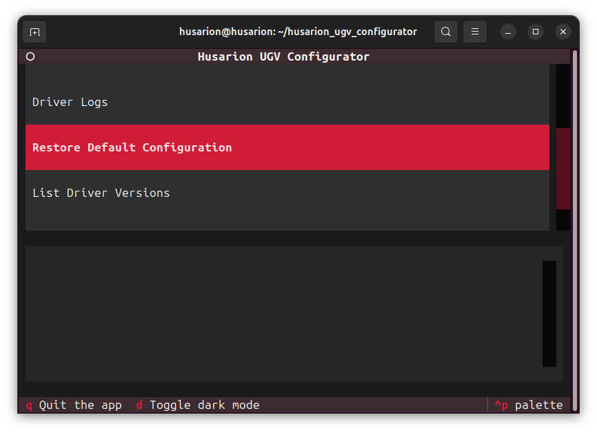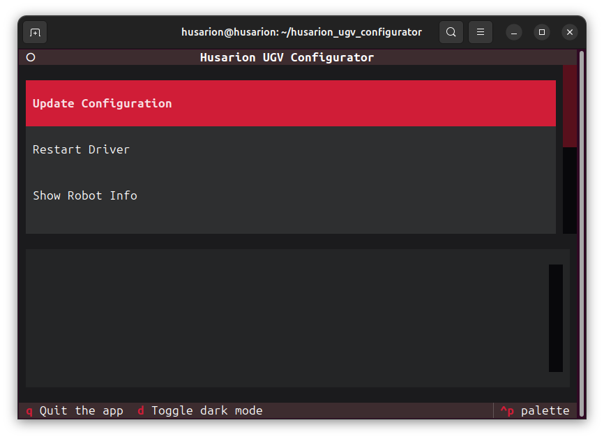 Husarion UGV Configurator is a Text User Interface (TUI) application designed to simplify the configuration and management of Husarion UGV platforms, including Panther and Lynx. It provides an intuitive, terminal-based interface for updating robot parameters, managing driver versions, debugging, and performing maintenance tasks.