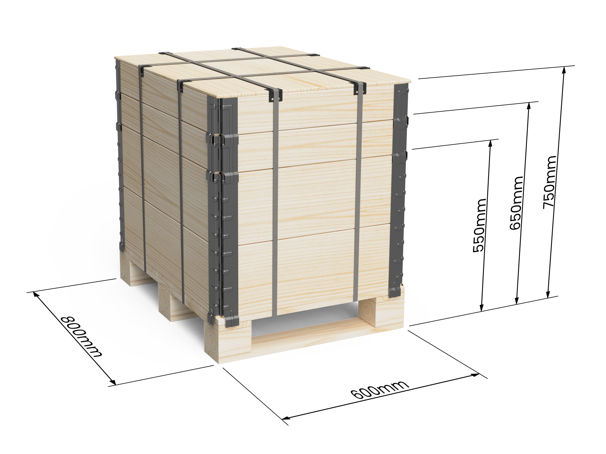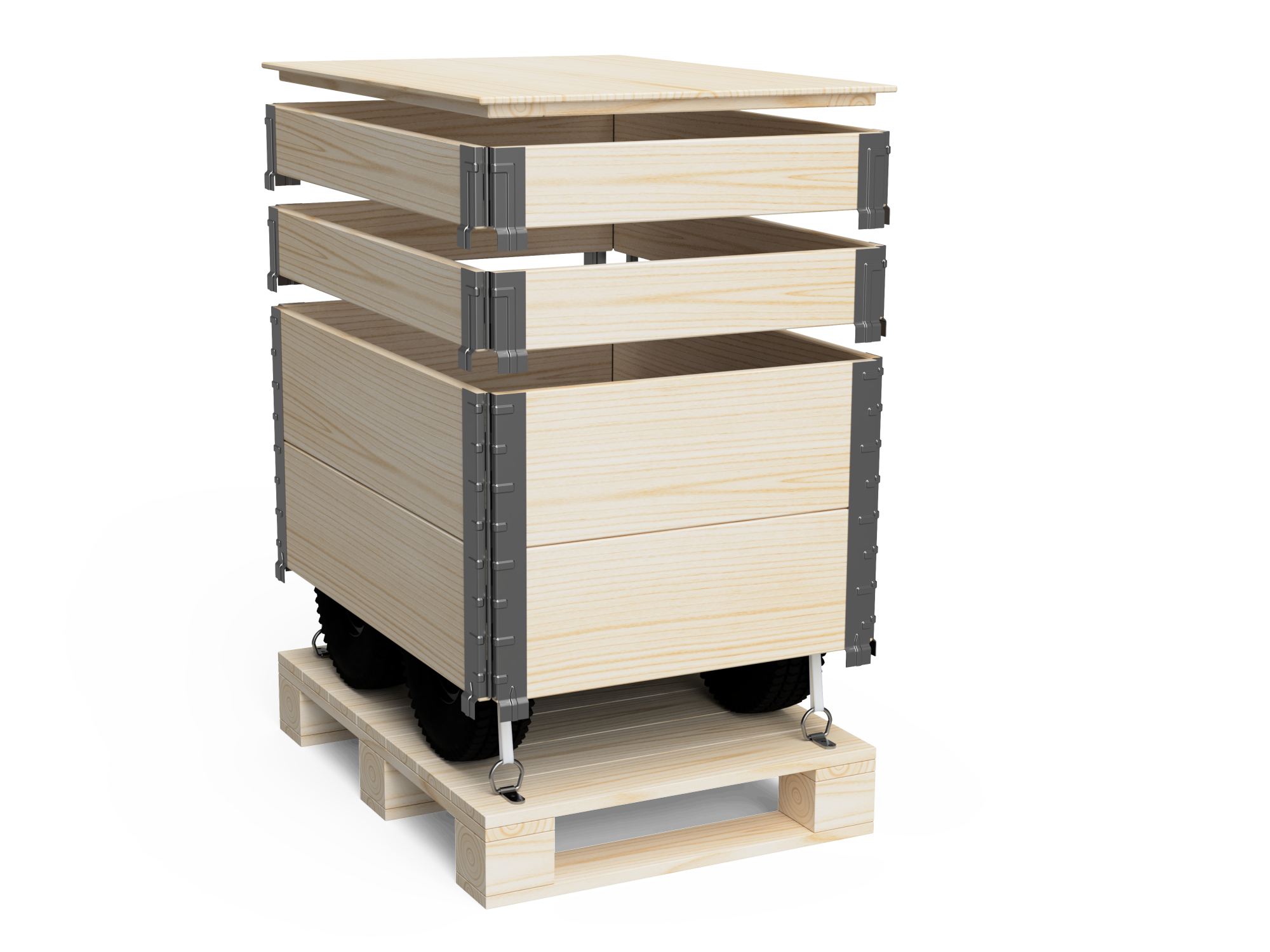 First, cut the plastic straps and open the top side (lid) of the box. Then you can remove the pallet extensions (walls).